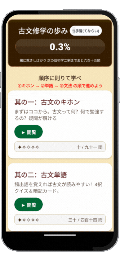 このすぐ下から演習パート。まずは 「⓪ 基礎用語」→「① 助動詞」の順がおすすめ。短時間でも効果が出ます。