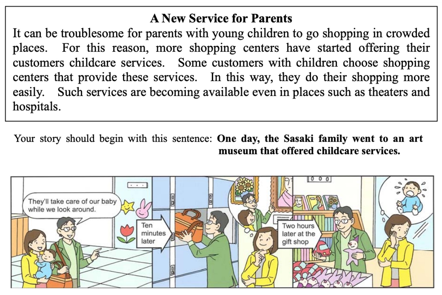 | Question about the passage | According to the passage, how do some customers with children do their shopping more easily? | Some customers with children choose shopping centers that provide childcare services. |
